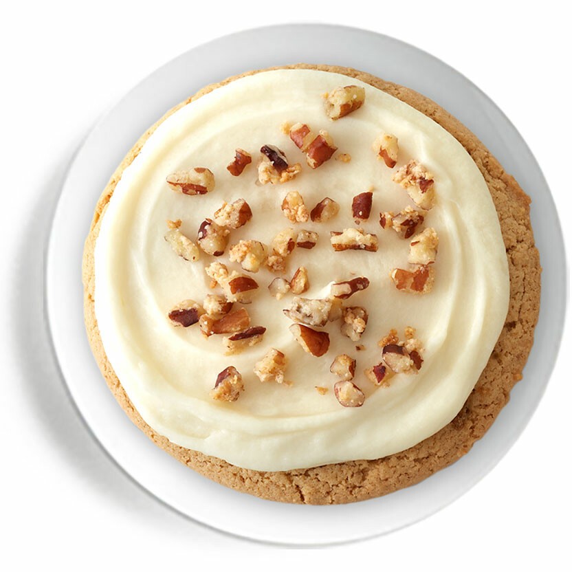 Our maple-infused cookie is smothered with creamy Maple Buttercream and topped with toasted and buttered pecans.